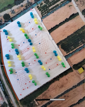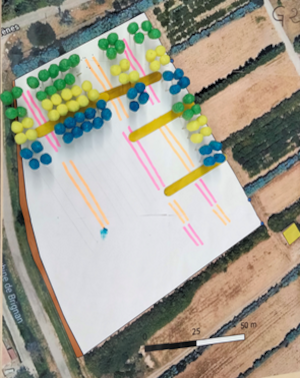 - Deux propositions d’aménagements d’infrastructures agroécologiques : une proposition limitant au maximum les coûts, le travail et gestion, avec notamment de la régénération spontanée des haies et une proposition cherchant à homogénéiser la répartition des IAE à l’échelle du dispositif factoriel.